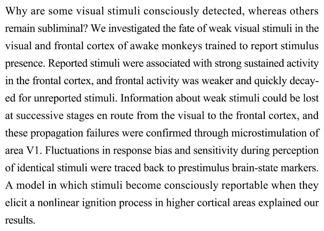 (导读 胡琦琳)本研究探究清醒的猴子视觉和额叶中弱刺激的归宿,这些经过训练的猴子能报告刺激的存在。研究表明刺激与额叶中持续强活动有关。报告的刺激信息可能在从视觉传输到额叶的过程中丢失,而这样的传输失败是通过 V1 区域的微刺激确认。当刺激在更高的皮质引发非线性激发过程时,便可以被有意识的报告。