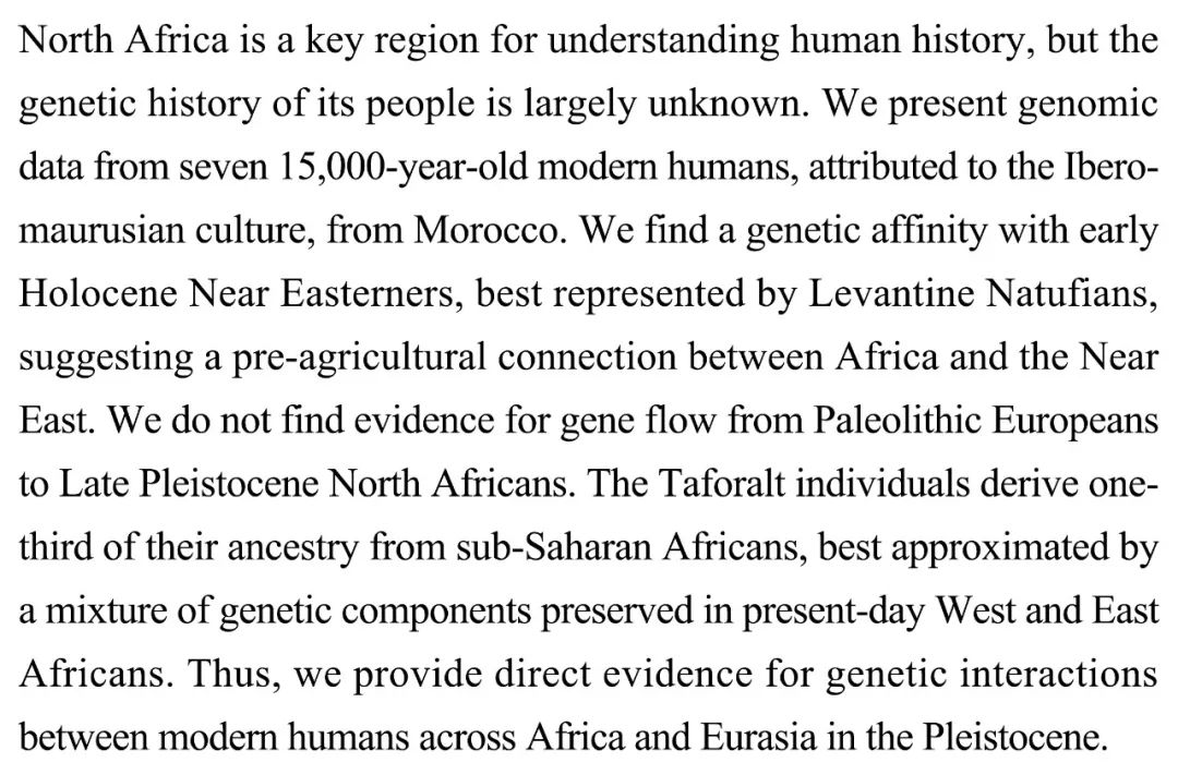(导读 郭思瑶)北非人类的遗传历史尚不清楚。本文对 1.5 万年前摩洛哥伊比利亚莫鲁斯文化时期的人类骨骼进行基因组测序,发现其与全新世早期近东人具遗传亲和性,暗示非洲与近东在农业时期前已有联系,Taforalt 人 1/3 的祖先源自撒哈拉以南非洲。这为更新世非洲与欧亚大陆的人类联系提供了直接证据。