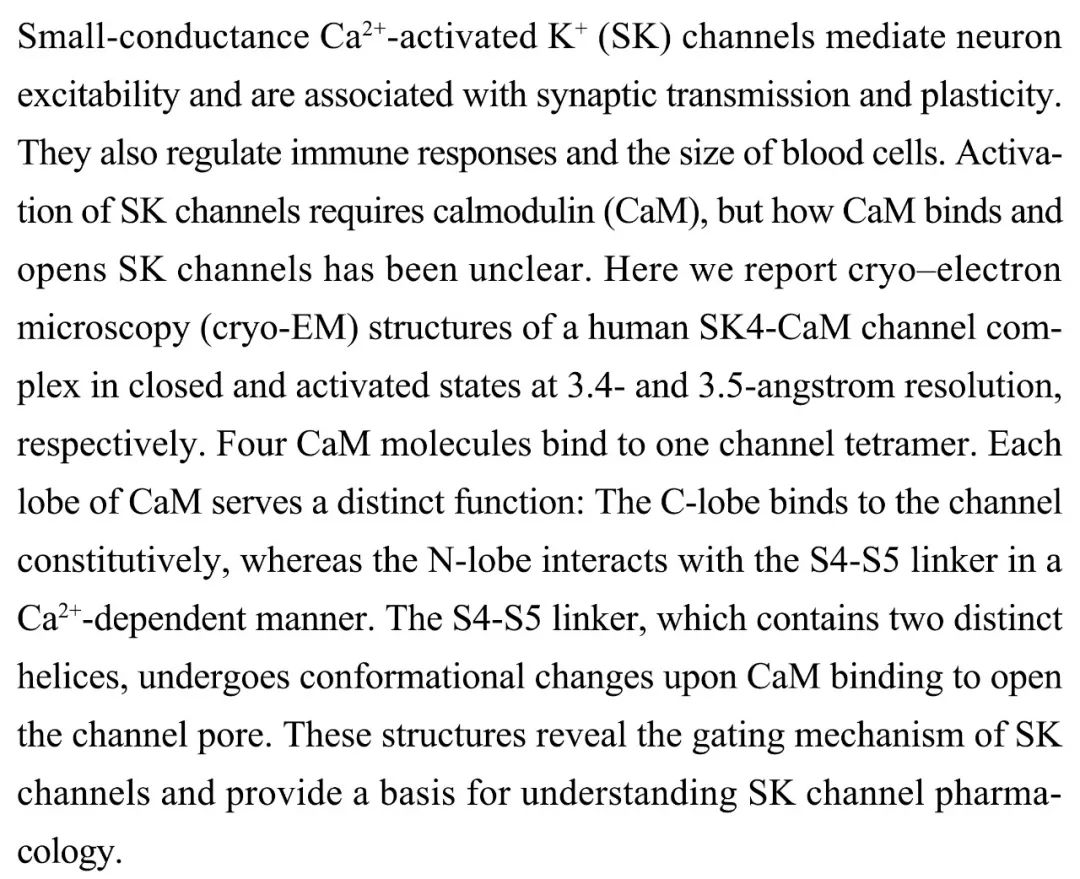 (导读 阿金)小电导钙激活钾(SK)通道具有介导神经元兴奋性,调节免疫反应等功能。但尚不清楚 SK 通道与钙调蛋白(CaM)的结合激活机制。本研究报道分辨率在 3.4 埃和 3.5 埃的人类 SK4-CaM 通道复合物激活和封闭状态下的冷冻电镜结构。展示 4 个 CaM 分子与通道四聚体的结合机制,以及各自的功能特性,为 SK 通道药理学提供理解基础。