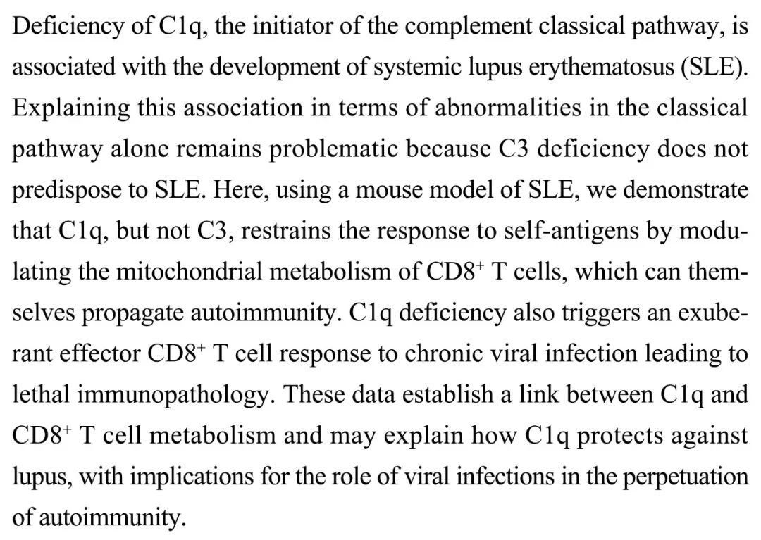(导读 阿金)补体经典途径始动因子 C1q 的缺乏与系统性红斑狼疮(SLE)有关,但具体机制不明。本研究使用 SLE 的小鼠模型,证明 C1q 通过调节 CD8+ T 细胞的线粒体代谢,抑制对自身抗原的响应,C1q 缺陷还触发效应 CD8+ T 细胞响应慢性病毒感染,导致致命免疫病理反应。研究数据建立起 C1q 和 CD8+ T 细胞之间的联系,为开发靶向药物提供理解基础。