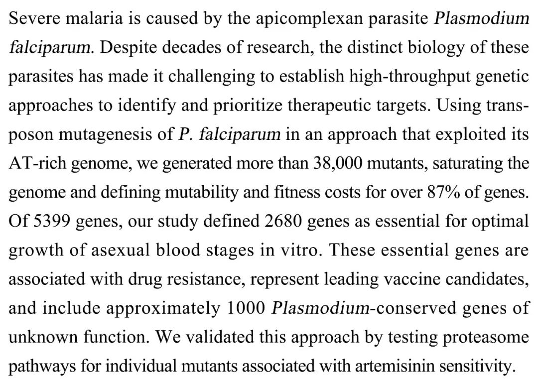 饱和诱变揭示人疟疾寄生虫恶性疟原虫的必需基因