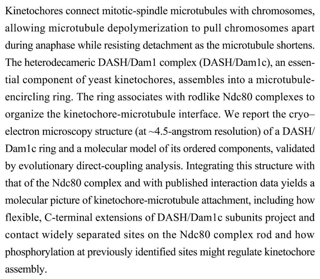 (导读 阿金)着丝点连接有丝分裂纺锤体微管与染色体,而 DASH/Dam1 复合物可组装成一个包围微管的环。本研究报道了分辨率约 4.5 埃的 DASH/Dam1c 环冷冻电镜结构,通过演化直接耦合分析验证其有序组成的分子模型,并将该结构与 Ndc80 复合物和公布的相互作用数据结合,得到着丝点—微管接合的分子图像。