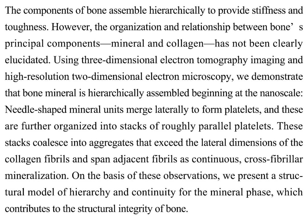 (导读 过泽远)分层结构为骨骼提供强度和韧性,但矿物质和胶原蛋白在骨中的组织方式尚不完全清楚。本研究使用 3D 电子断层成像技术和 2D 电子显微镜证明了分形式的分层组织从纳米尺度开始: 针状矿物质单元横向组成小板,小板平行堆叠为板叠(stack),板叠又相互聚集在一起形成在尺度上超越胶原纤维的矿物质聚集,从而将相邻纤维结合在一起。这些观察结果为更完整骨骼结构模型的建立提供帮助。