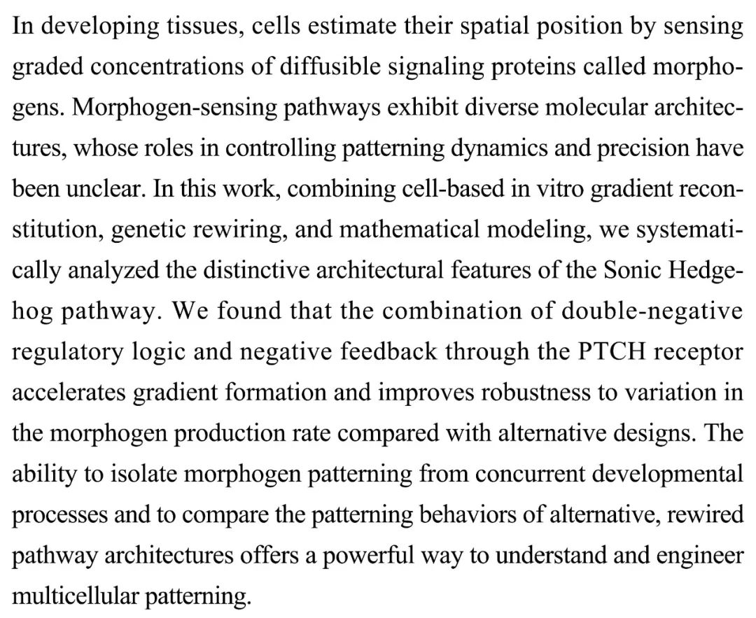 (导读 郭怿暄)在发育的组织中,细胞可通过感知信号蛋白成形素的浓度梯度来估计自身空间位置,但成形素感知通路控制其分布的动态变化和准确度的机制尚不清楚。本研究通过结合体外细胞梯度重建,基因重联和数学建模,系统地对 Sonic Hedgehog 通路的不同构成性特点进行分析。发现结合通过 PTCH 受体双重反向调节逻辑和负反馈可加速梯度建立,改善成形素生成速率变化的稳健性。