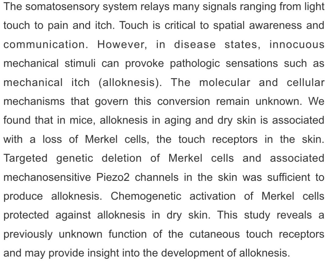 (导读 郭怿暄)病理状态下无害的机械刺激可产生病理性感觉,如机械痒(痒觉异化),但其分子机制尚不清楚。本研究发现小鼠中因衰老或皮肤干燥出现的痒觉异化与触觉接收器 Merkel 细胞的丢失相关。靶向敲除皮肤中 Merkel 细胞以及机械敏感的 Piezo2 通道可引起痒觉异化,而使用化学遗传学方法激活 Merkel 细胞可以保护干燥皮肤免遭慢性瘙痒。