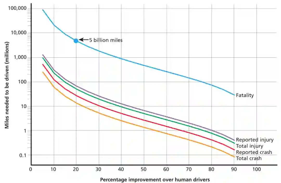 著名战略咨询公司兰德就无人驾驶的安全可靠性及所需路测里程进行了统计分析[3],其分析报告显示,在 95% 的置信度下,无人驾驶系统需要进行约 50 亿英里的路测才可证明其事故率显著小于人类驾驶员,也就是 100 辆车在全天 24 小时、全年 365 天及平均车速为 25 英里每小时的情况下,需要测试约 225 年!