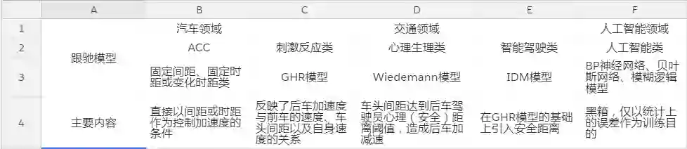 按照现有的分类方式,跟驰模型分为交通工程学和心理生理学两大类,或者是交通工程和统计物理两大类,虽然分类方法有所差异,但是所指的模型均为过去六十多年跟驰行为建模研究中的典型模型[13]。其中主要包括汽车领域中实际应用的 ACC 中的模型,交通领域中的刺激反应类、心理生理类模型以及人工智能类模型等,如下表所示: