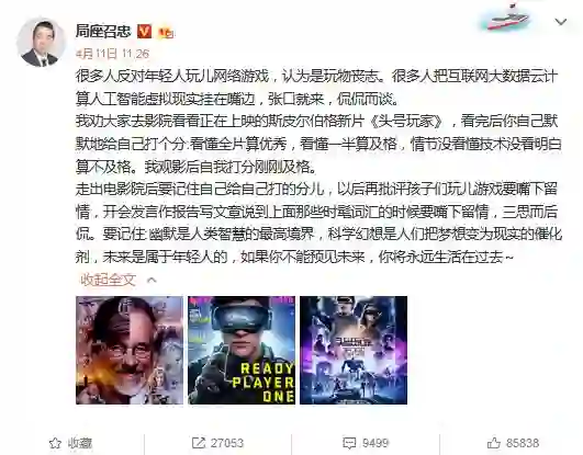 不过最近热映的电影《头号玩家》向世人展现了电子游戏的不同面貌。著名军事专家、“局座”张召忠在观影之后,不光强推电影,全国青少年喜爱的“局座”还发表了自己的观后感,引来网友一片叫好。。。