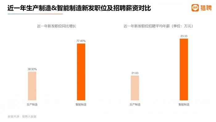 据猎聘大数据显示,智能制造的职位同比增长表现突出,近一年比上一年增长77.45%,几乎是整个生产制造大领域新发职位增速的2倍。且智能制造近一年的招聘平均年薪为23.33万元,比上一年增长17.97%,比生产制造高2.3万元,在薪资上优势明显。