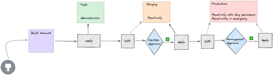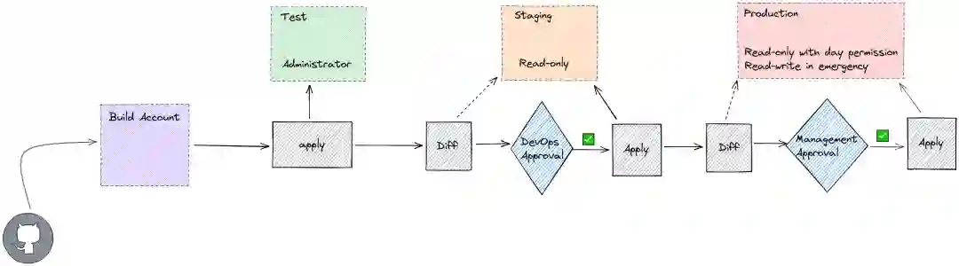 与模拟环境一样,生产对开发来说也都是全部只读的。任何涉及这两个环境中的更改都应该通过 IaC 并且有管理层的审批。