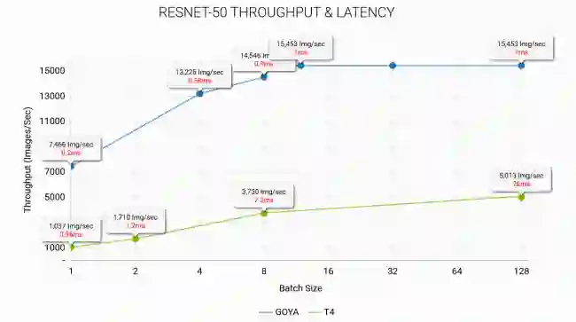 在性能方面,芯片热设计功耗为140W,在ResNet-50上每秒可处理1650张图像,比Nvidia的Tesla V100高出14%,功耗仅为后者的一半。每秒每瓦可处理的图像数量提升了两倍以上。