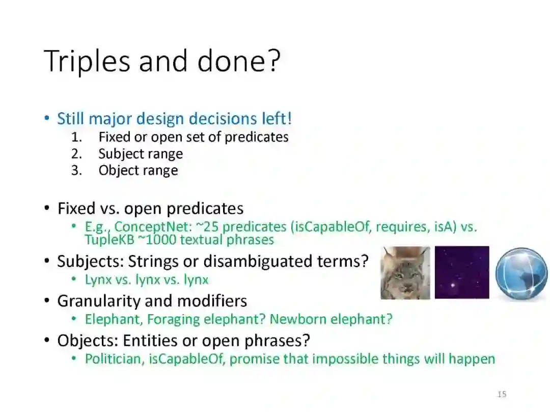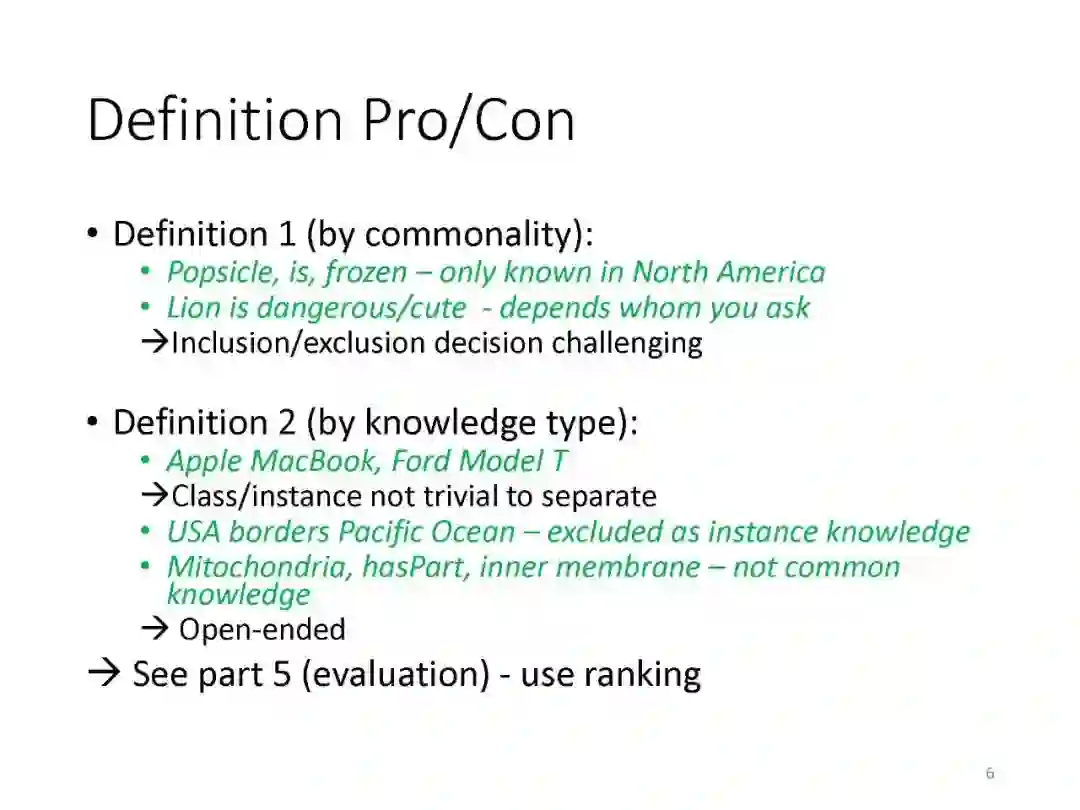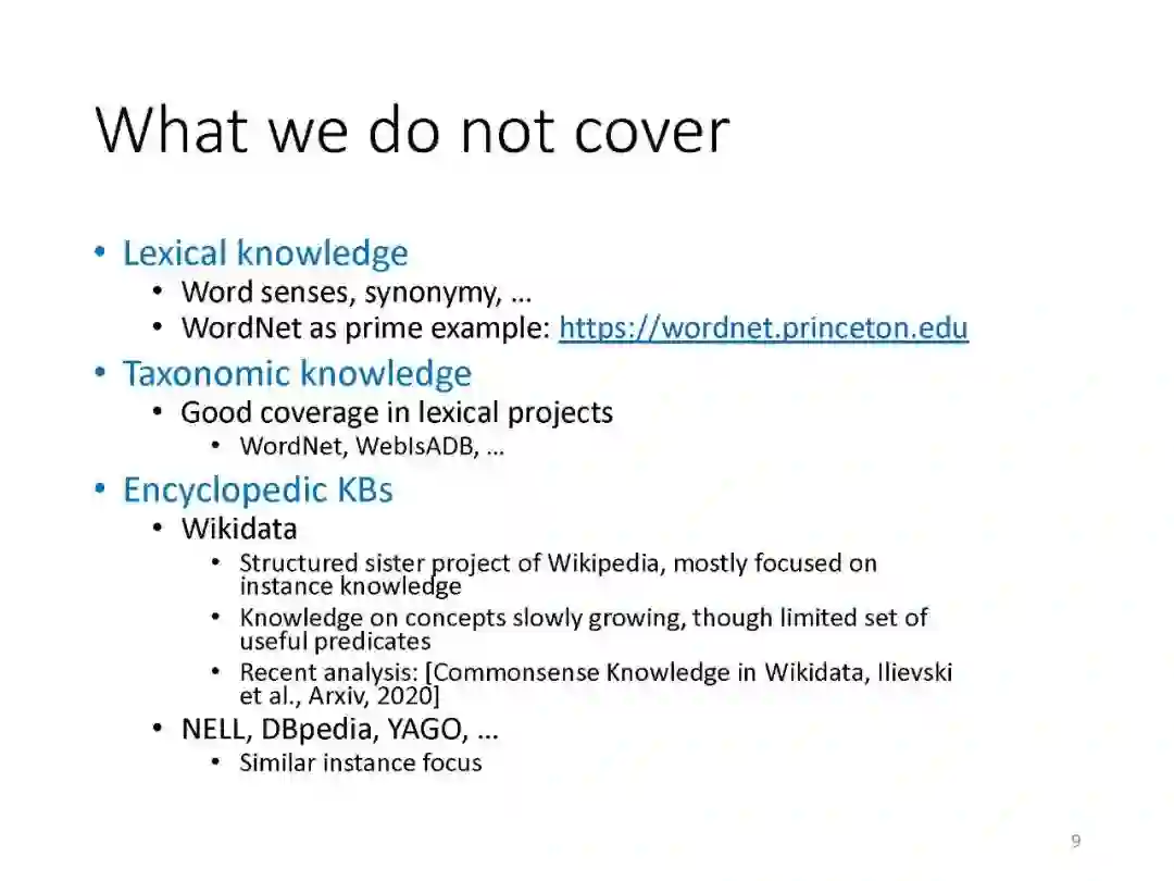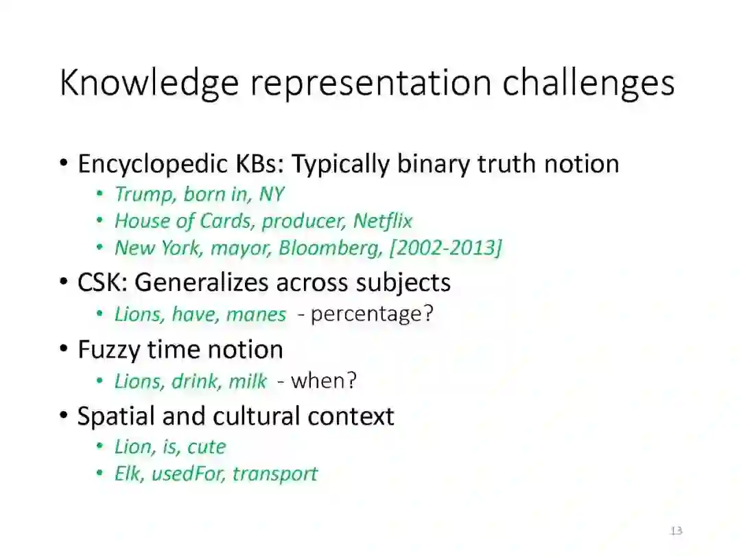 常识性知识是人工智能应用的基础。尽管面向实例的断言的信息提取和知识库构建(例如布拉德·皮特的出生日期或安吉丽娜·朱莉的电影奖)已经得到了很多关注,但关于一般概念(政客、自行车、打印机)和活动(吃披萨、修理打印机)的常识直到最近才得到解决。在本教程中,我们为汇编和巩固这些常识知识(CSK)提供了最先进的方法。我们将介绍基于文本提取、多模态和基于Transformer的技术,特别关注与WSDM社区相关的web搜索和排名问题。
