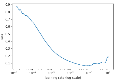 如果我们对每次迭代的学习进行记录,并绘制学习率(对数尺度)与损失,我们会看到,随着学习率的提高,从某个点开始损失会停止下降并开始提高。在实践中,学习速率的理想情况应该是从图的左边到最低点(如下图所示)。在本例中,是从 0.001 到 0.01。