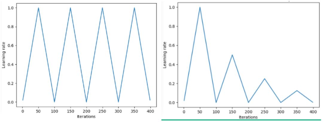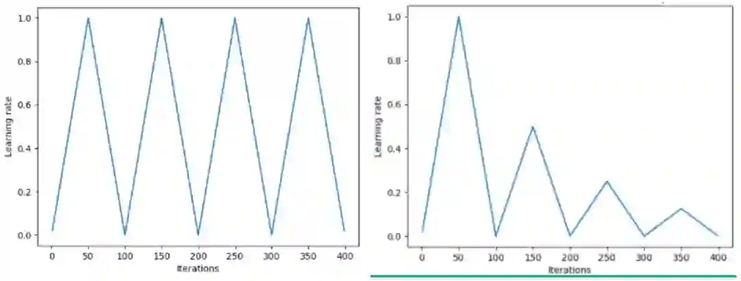 Leslie N. Smith 提出的「Triangular」和「Triangular2」学习率周期变化的方法。左图中,LR 的最小值和最大值保持不变。右图中,每个周期之后 LR 最小值和最大值之间的差减半。