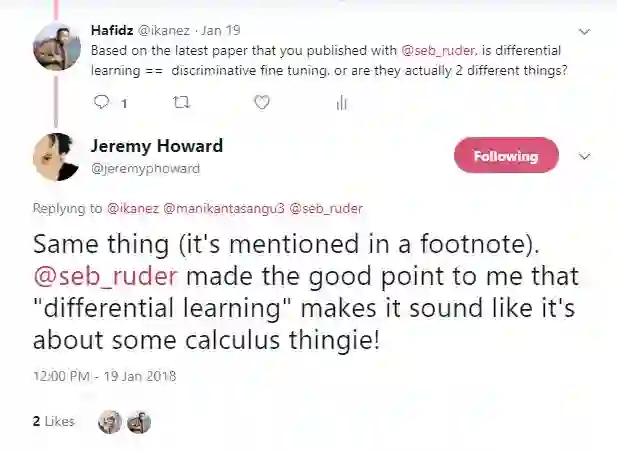 在写这篇文章的时候,Jeremy 和 Sebastian Ruder 发表的一篇论文深入探讨了这个问题。所以我估计差异学习速率现在有一个新的名字——差别性的精调。:)