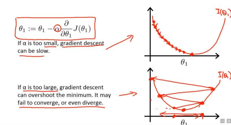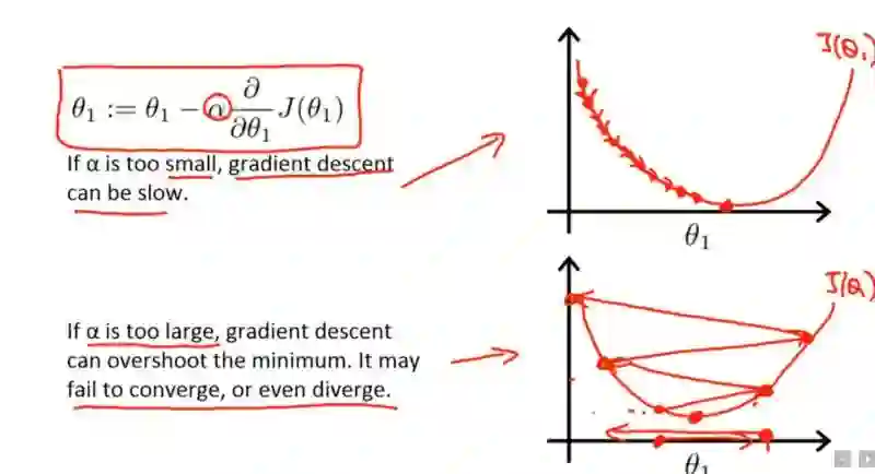 采用小学习速率(顶部)和大学习速率(底部)的梯度下降。来源:Coursera 上吴恩达(Andrew Ng)的机器学习课程。