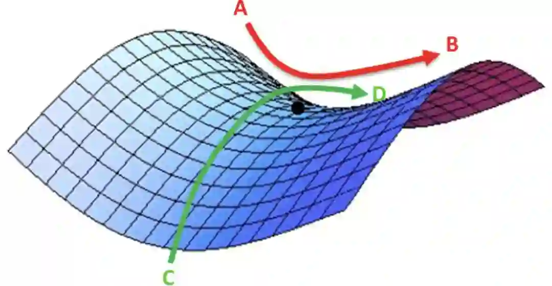 误差曲面中的鞍点。鞍点是函数上的导数为零但不是轴上局部极值的点。(图片来源:safaribooksonline)