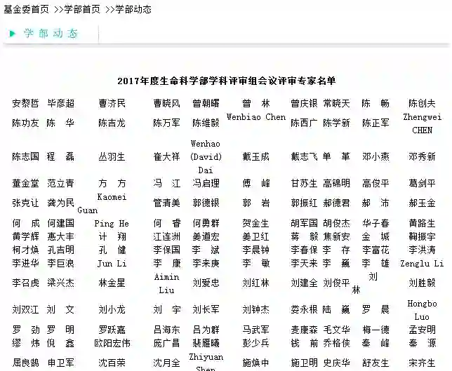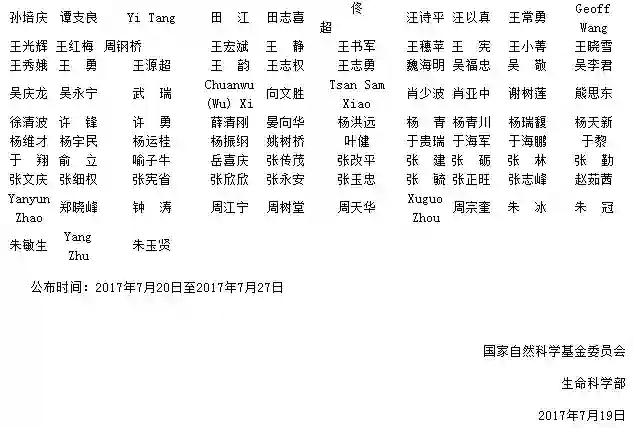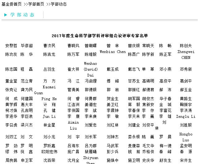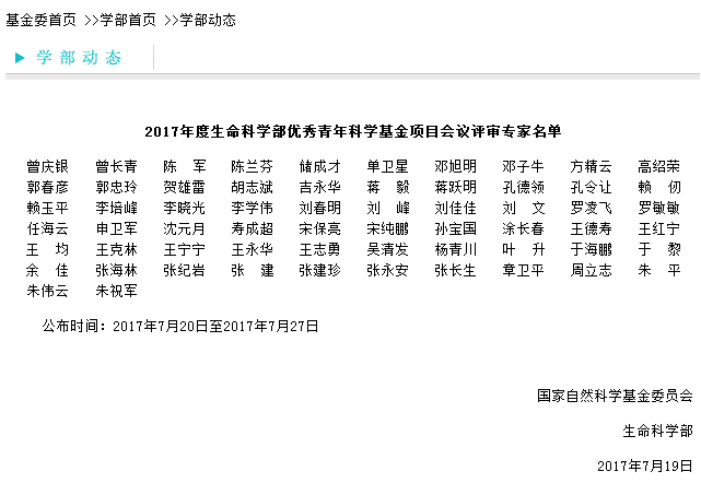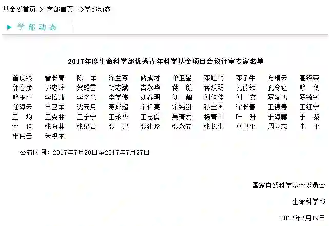 2017年度生命科学部优秀青年科学基金项目会议评审专家名单
