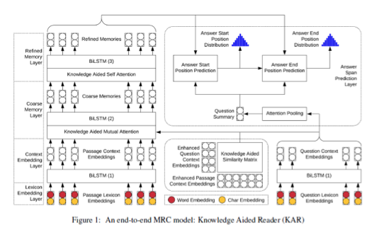 (2)作者提出了一个名为知识辅助阅读器(KAR)的端到端MRC模型,该模型使用提取到的常识来辅助其注意机制,增强模型的阅读理解能力,削弱噪声的影响。实验证明了模型的先进性。