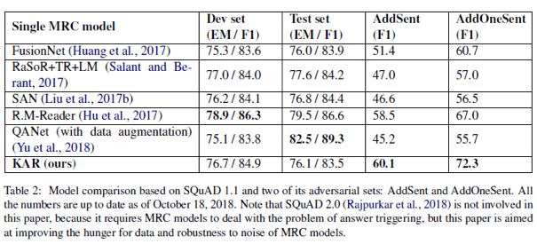 作者将KAR需要与其他MRC模型的性能和抗噪性进行比较,具体来说,不仅需要评估开发集和测试集上KAR的性能,还要评估对抗集上的性能。所以主要和以下五个模型进行了比较: