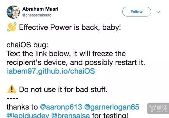 这个问题最早由 Twitter 用户 Abraham Masri 发现,是一个基本的GitHub链接,大家现在将其称之为“chaiOS”。在经过网友和媒体们的测试,已经发现了以下这些可能出现的情况:比如通过信息应用程序发送该链接给他人时,发件人和收件人的信息应用程序会立即冻结和崩溃,想要恢复正常只能够重新获得信息应用线程的访问权限,删除之后在打开。