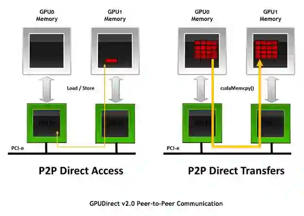 为了更好地发挥GN5多GPU卡并行计算效率,GN5支持GPUDirect,通过GPU卡之间点对点通信,可让GPU之间在无需CPU干预下,直接通过PCIe的总线进行高带宽低时延的互联通信,极大地提升了深度学习训练中模型参数交换效率。
