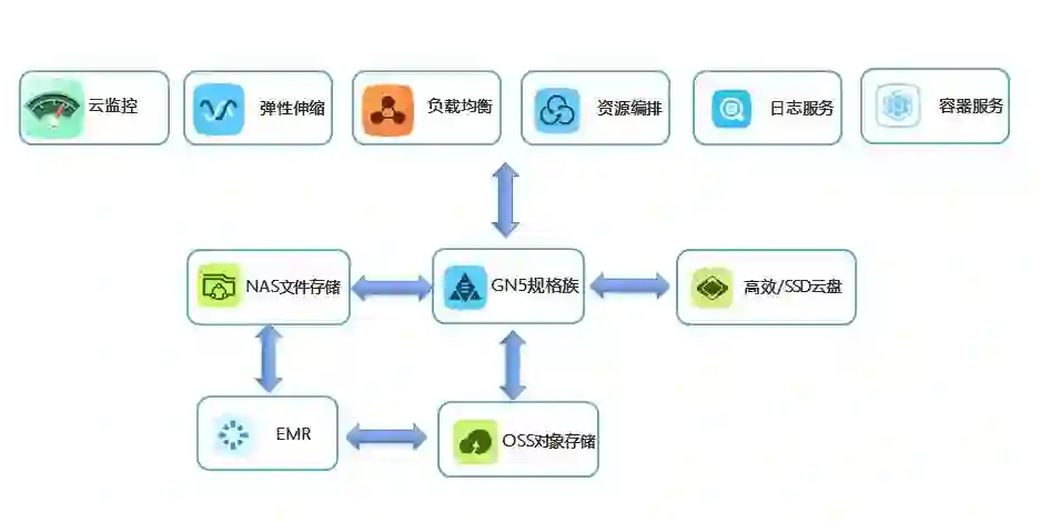 除了GPU外,深度学习还需要有海量的数据存储能力、业务服务能力、监控能力等,这在传统模式下复杂度高、工作量大、费时费力。而GN5实现了与ECS弹性计算生态的完美结合,可与OSS对象存储、NAS文件存储等打通,满足深度学习海量训练数据的低成本存储和访问要求;通过EMR服务进行预处理;通过云监控服务进行GPU资源的监控与告警;通过负载均衡、弹性伸缩、资源编排等快速在云端搭建完整弹性GPU服务;并可搭配容器服务使用,简化部署和运维的复杂度,提供资源调度服务等。