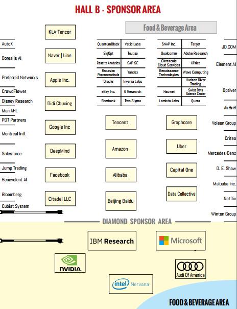 其他档位的赞助商中,熟悉的名字包括京东、Juergen Schmidhuber的Renaissance、Maluuba、Yoshua Bengio做顾问的Element AI,华为、今日头条,360,以及Eric Xing教授联合创立的Petuum。