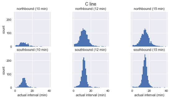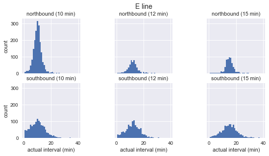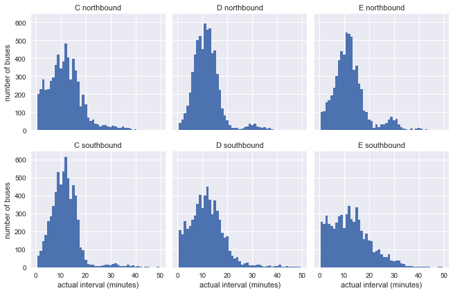 利用这些清理过的数据,我们可以绘制每个公交路线、行驶方向和到站频率的公交车“实际”到站间隔分布: