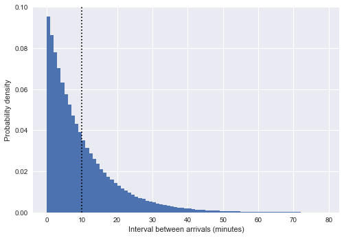 图中虚线表示平均到站时间为10分钟。可以发现,上图分布形状很像指数分布,这并不是偶然:我们把公交车到站间隔模拟成均匀随机数的做法十分类似泊松过程,而如果构成泊松过程,到站间隔的分布一定符合指数分布。