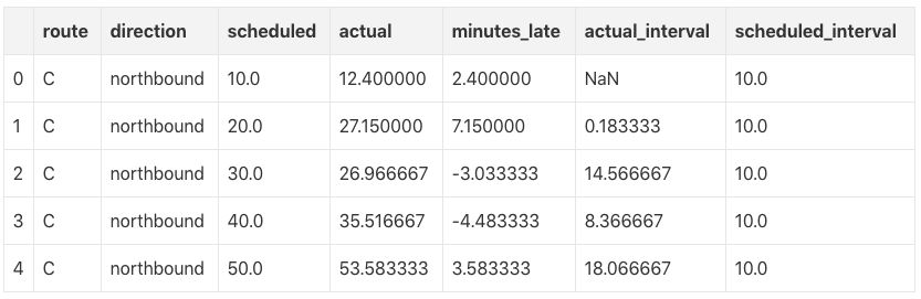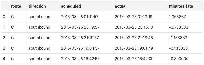 df = df[['route', 'direction', 'scheduled', 'actual', 'minutes_late']].copy()