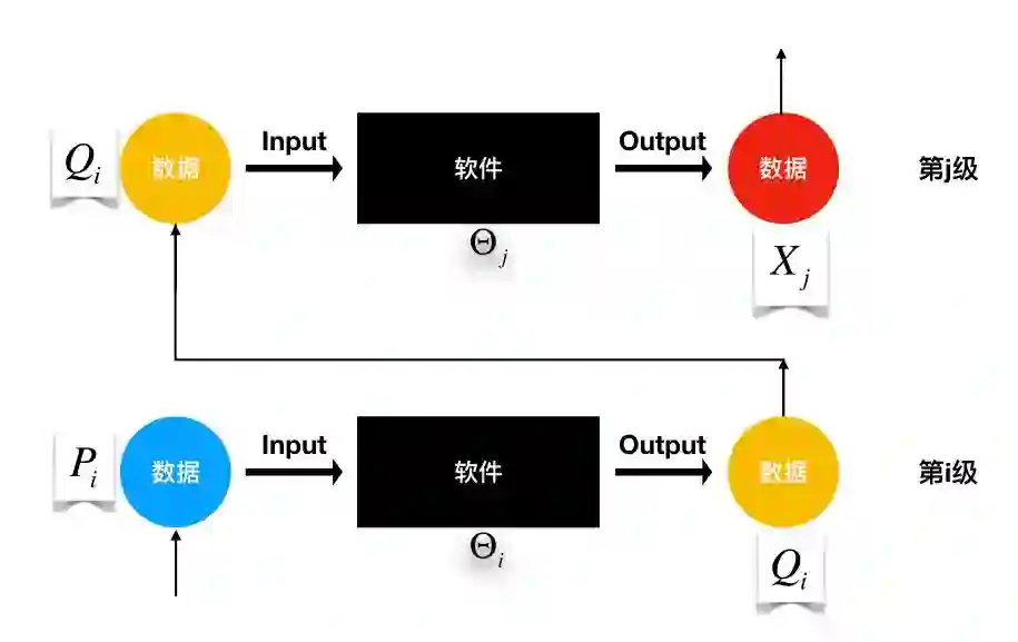 以经济学的视角,人们越来越倾向于将处理数据(Data Processing)的软件(Software)与数据(Data )分开来考察。这两者完全是不同属性、具有不同效用的商品。由此,可以基于经济学研究目的,来定义软件[The Economic Properties of Software,Sebastian von Engelhardt, 2008]和数据的概念。在数字经济中,软件和数据的关系示意图[基于DIKW体系以及数字经济价值链关系构建]如下。