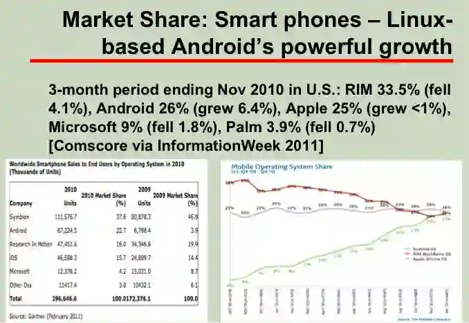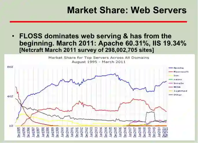 David. Wheeler构建了一套指标体系,用来说明开源软件的独特优势。用非常翔实的数据,分析指出,开源软件在各个领域的市场上都拥有较大的市场占有率、更可靠稳定的性能、更高的安全性以及规模效应。(例子:下图为web server以及智能手机操作系统的比较)