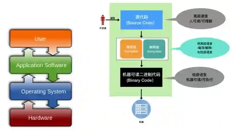 源代码相对机器语言而言,是一种高级语言(如C、Python、Java等),主要是便于人们编写、阅读和理解。机器语言是机器可读/可执行的语言。任何软件要能够工作(runtime),必须由编译器或解释器将源代码转换为二进制代码。转换为二进制代码后才能在机器/虚拟机(VM)上运行。(示意图如上右)