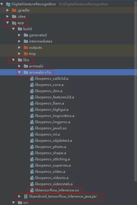 其次,把刚刚下载的 libandroid_tensorflow_inference_java.jar 文件放到 app/libs 目下,把libtensorflow_inference.so 放到 app/libs/armeabi-v7a 目录下,如下图所示: