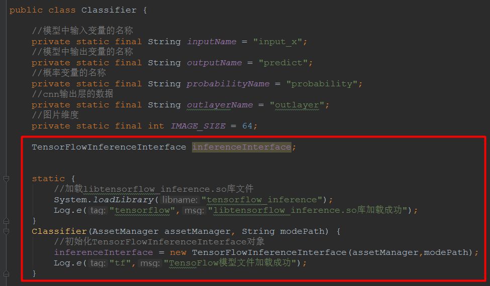 TensorFlowInferenceInterface inferenceInterface; static { //加载libtensorflow_inference.so库文件