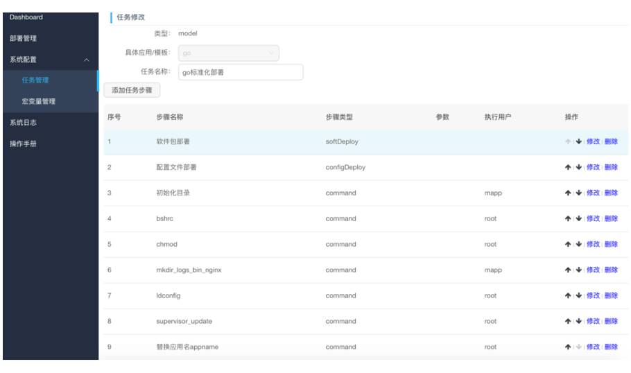 如第一步,部署安装软件;第二步配置文件;第三步初始化等等。根据我们应用的部署类型建立不同的部署需要执行的步骤,按照定义执行步骤能完整地构建起一个应用的运行环境。