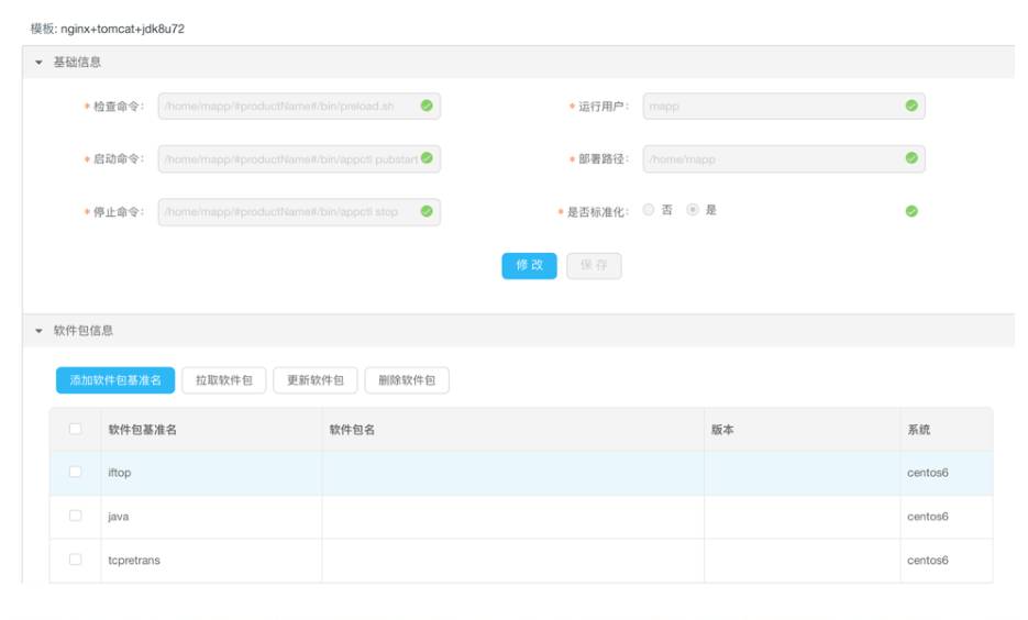 应用基线建立的维度我们是按照应用分组维度来建立的。一般情况下应用基线部署的内容配置都是从部署模板里面导过来的,基本上都能满足相应的应用部署环境的需要。