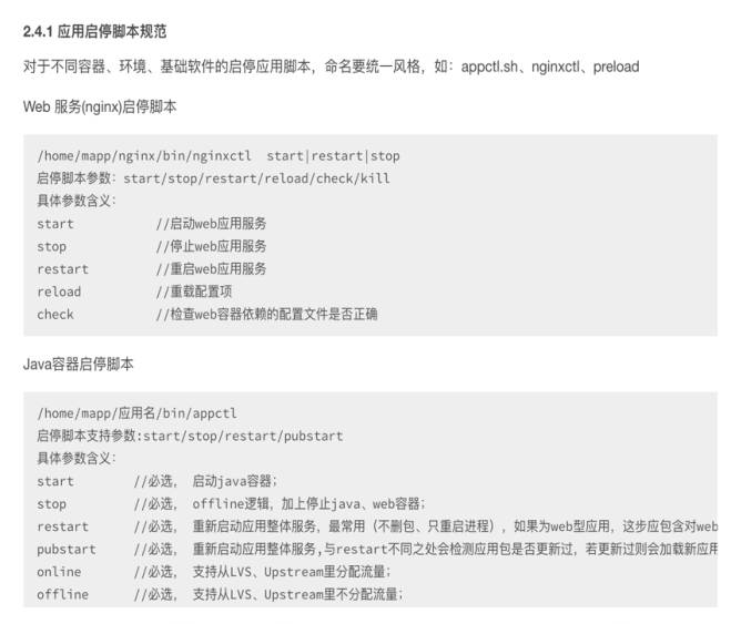 接下来我们还规范了启停脚本,定义了这个脚本里面传的参数,可以支持哪些参数,启动或者重启;每条指令里面做什么事情都进行了说明和规范。