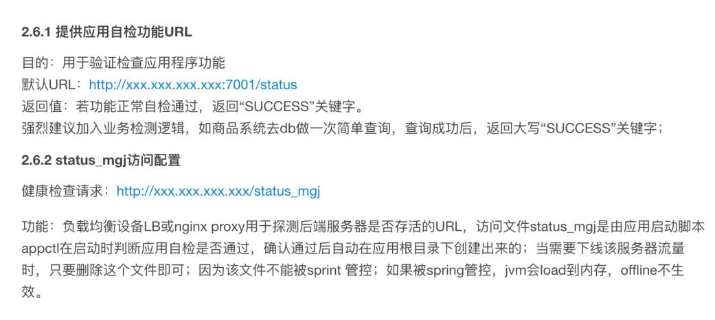 上线之前需要业务方提供标准的自检功能,要怎么知道你这个应用是成功还是失败的,那肯定需要有一个检测机制告诉我,脚本里面通过这个检测机制知道这个业务到底是否正常,这是一个强制性的规范。