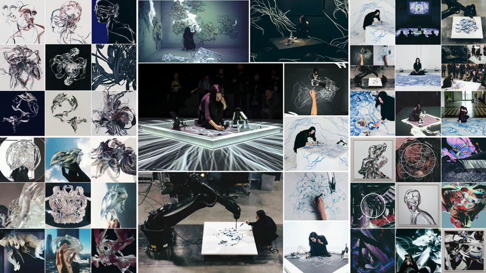 钟愫君(Sougwen Chung)是一位加拿大籍华裔跨学科艺术家,目前定居在纽约。早年拥有编程经历的她,从2014年开始接触机器人。如今钟愫君作为麻省理工学院媒体实验室前研究员、谷歌驻场艺术家,已成为人机协作领域的先驱人物,在全球范围内拥有出色表现。