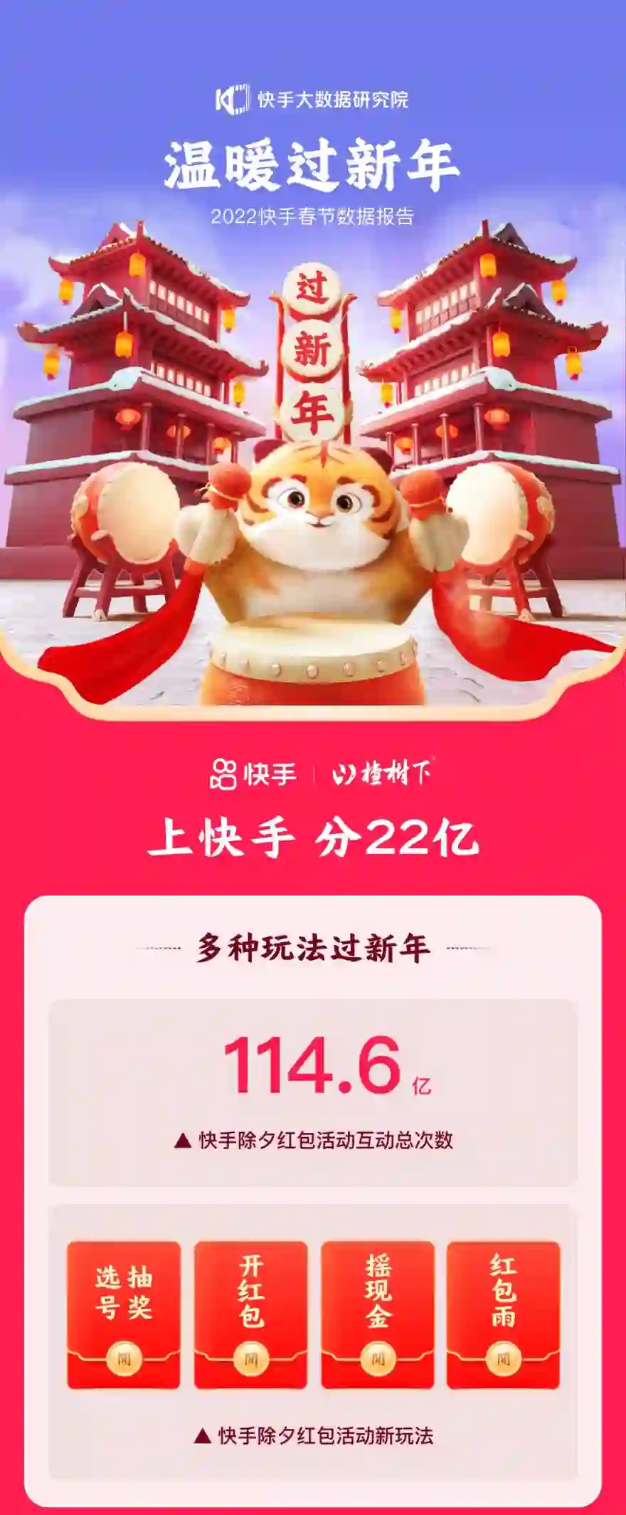 这种大战的硝烟感在2022年春节几近消失,取而代之的,是更多有温度、有欢乐的活动。比如快手在今年就继续分22亿红包,但主题变成了宠粉、分福利,通过多样的玩法让用户感受到春节的气氛。而在快手等平台上抢红包,成为了很多用户的新年俗。