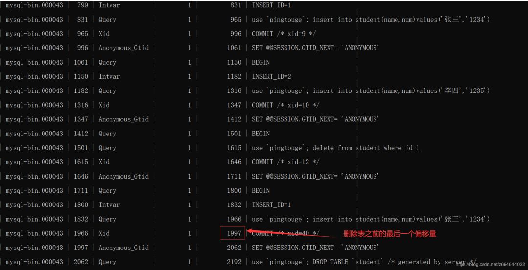 通过查看 binlog 日志发现创建数据库 pingtouge 的开始偏移量为 219,删库之前的最后偏移量为 3861,有了这两个偏移量之后,执行: