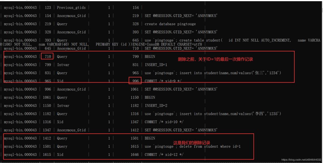 我们在 binlog 日志文件中找到 student 表中 id=1 这条数据在删除之前的最后一次操作的起始偏移量和结束偏移量,在上图中,我已经标出,起始偏移量为:710,结束偏移量为:996。有了这两个参数之后,我们就可以使用 mysqlbinlog 命令来恢复数据了。