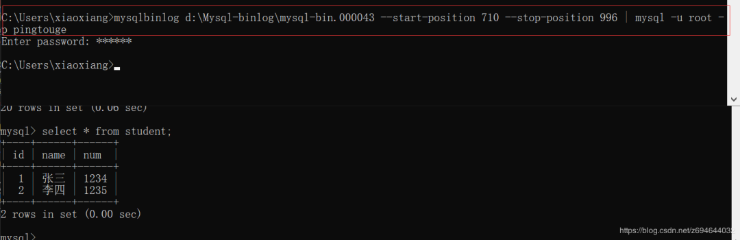 mysqlbinlog d:\Mysql-binlog\mysql-bin.000043 --start-position 710 --stop-position 996 | mysql -u root -p pingtouge;