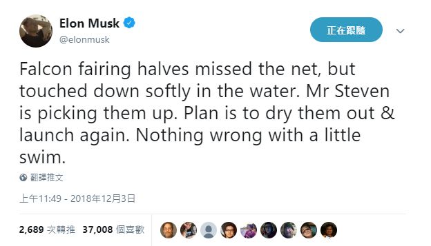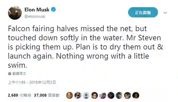 不过,马斯克称SpaceX计划等整流罩晾干后再次开始发射任务。