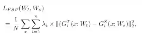 相比传统的蒸馏方法直接用小模型去拟合大模型产生的 soft target,论文「A Gift from Knowledge Distillation: Fast Optimization, Network Minimization and Transfer Learning」用小模型去拟合大模型不同层特征之间的转换关系(flow of the solution procedure),其用一个 FSP 矩阵(特征的内积)来表示不同层特征之间的关系,计算公式如下: