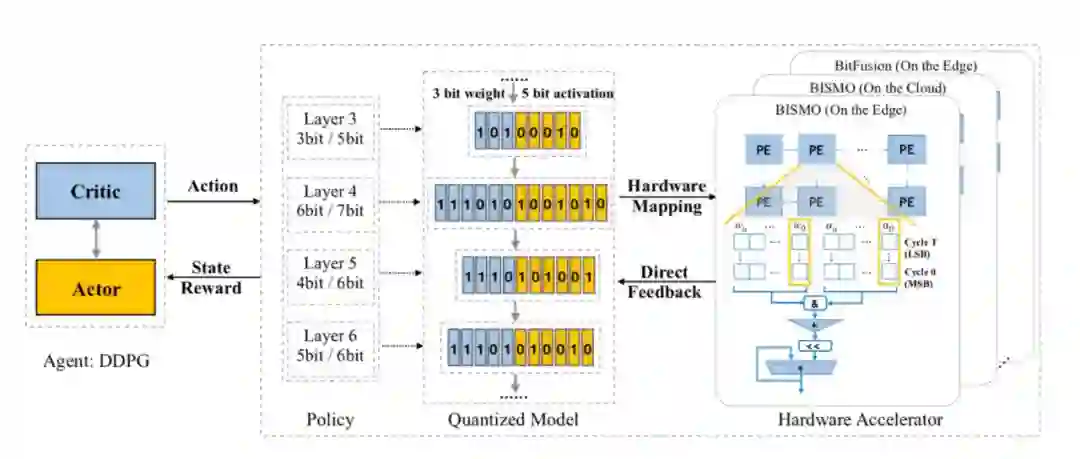 和剪枝类似,在参数量化方向,论文「HAQ: Hardware-Aware Automated Quantization」搜索出每层最优量化位宽已达到最佳的整体量化收益。整体框架和搜索剪枝的类似,如图 7 所示。