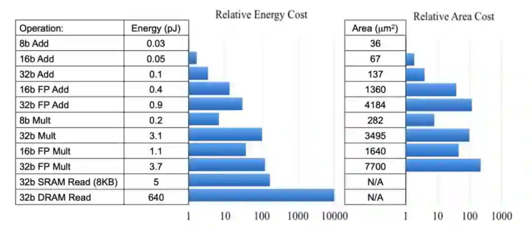 低精度定点数操作的硬件面积大小及能耗比高精度浮点数要少几个数量级,如图 11 所示。使用 8bit 定点量化可带来 4 倍的模型压缩、4 倍的内存带宽提升,以及更高效的 cache 利用 (很多硬件设备,内存访问是主要能耗)。除此之外,计算速度也通常具有 2~3 倍的提升。另外在很多场景下,定点量化操作对精度并不会造成损失。