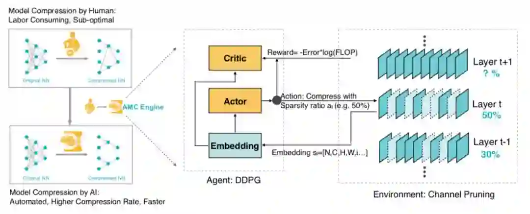 在众多的压缩加速方法中,通道剪枝已经被证明非常有效,并在实际业务中广泛应用。通道剪枝压缩后模型不仅在大小上有收益,并且不需要依赖特殊的预测库就能加速,但由于神经网络中不同层的允余程度不同,并且不同层之间存在相互依赖关系,如何确定每一层的压缩率变得十分困难,论文「AMC: AutoML for Model Compression and Acceleration on Mobile Devices」提出使用强化学习搜索每一层最优的剪枝比例。